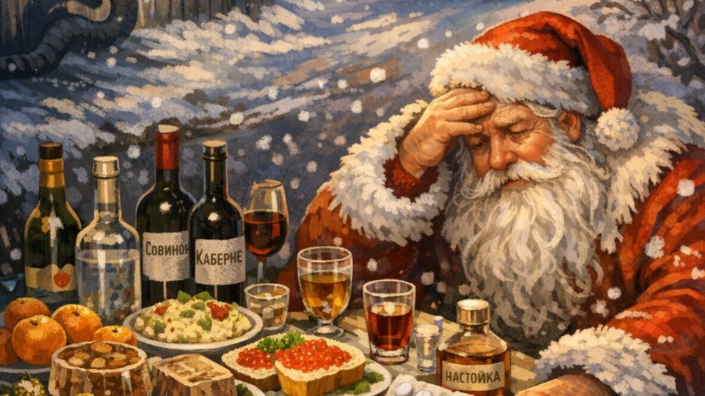 Уползает год вчерашний, Тень бросает на плетень. Для людей — счастливый праздник, Нам — тяжёлый трудодень. От стихов до анимаций Полон список адресов. Нужно только продержаться До двенадцати часов... Здесь на лирику и прозу Договорная цена. В наше время Деду Морозу Печень крепкая нужна. Всё могу для вас исполнить — И бель-канто, и шансон. Дайте только, братцы, вспомнить, Где забыл аккордеон... Вам — путёвка на Кайманы И рассрочка на авто. Всё конкретно, без обмана — Мы не в цирке-шапито. Будет муж тебе красивый, А любовник бросит пить. Деду Морозу всё по силам — Дайте только закусить... На столе — икра и шпроты, Холодец и «Оливье». Наливают доброхоты «Совиньон» и «Каберне». За конец вражды с соседом, Мир и дружбу на Земле — Есть у каждого для Деда Рюмка водки на столе. В доме номер пять — настойка, На Тверской — «Абрау-Дюрсо». Вдаль несёт лихая тройка Звон хрустальный бубенцов. Кум страдает от икоты — Моет косточки кума. Но уже смотался кто-то За чекушкой в закрома... На закуску — мандарины, А с утра, наверняка, Две таблетки аспирина И пивасик для рывка. У сограждан — выходные: Пиво, водка и коньяк. Уползает год Змеиный — Бьёт копытом год Коня...