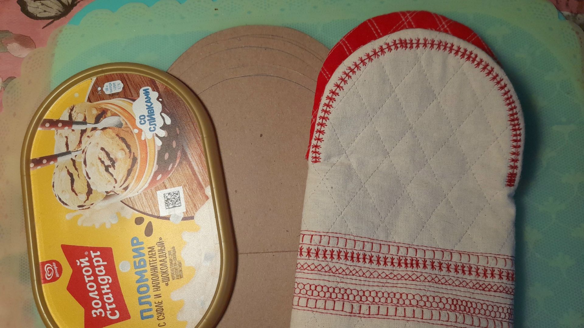 Такая простая варежка-прихватка. Хочешь сшить, а выкройки нет. Подходящий шаблон можно найти в интернете, а можно сделать самостоятельно. А в качестве шаблона подойдет крышка от упаковки мороженного. Сделать основу, а потом моделировать (расширять, удлинять, изменять) как угодно и без помощи других мастеров.