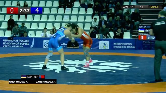 ЧР по вольной борьбе среди женщин. Ологонова И.(БУР) и Сальникова Л.(КЕМ) - квалификация, 57кг
