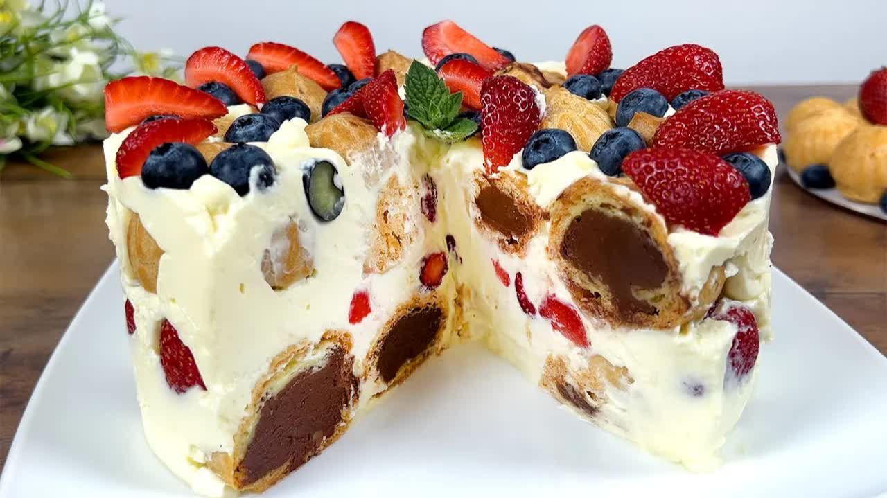 Привет, друзья! Сегодня я хочу поделиться с вами настоящей находкой для сладкоежек. Это не просто десерт, а настоящий зимний хит, который покорит ваше сердце с первого кусочка. Представьте себе любимое заварное пирожное, только в формате большого и красивого торта, который станет главным украшением любого праздничного стола. Если вы любите нежные текстуры и сливочный вкус, то этот рецепт точно для вас. Мы приготовим невероятно воздушный десерт, который сочетает в себе пористую, легкую основу из особого теста и богатый, шелковистый крем. Сверху всё это великолепие можно дополнить свежими ягодами и насыщенным шоколадом. Это идеальная альтернатива привычным бисквитным тортам, когда хочется чего-то изысканного, но нет желания тратить весь день на кухне. Готовится он удивительно просто, а результат выглядит так, будто вы заказали его в дорогой кондитерской. Особенность этого блюда в том, что оно не требует долгой и нудной сборки по коржам. Все выпекается достаточно быстро, а начинка на основе сливочного сыра получается в меру сладкой и очень стабильной. Ягоды добавляют приятную кислинку и свежесть, идеально оттеняя сладость основы. Попробуйте приготовить этот кулинарный шедевр для своих близких, и они обязательно попросят добавки. Это отличное решение для уютного семейного чаепития или встречи гостей. Ингредиенты Горький шоколад 170 г Молочный шоколад 90 г Сливки (33% жирности) 260 мл Яичные желтки 3 шт Сахар 60 г Кукурузный крахмал 40 г Молоко 400 мл Соль 1 щепотка Сахар 100 г Вода 250 мл Соль 1 щепотка (дополнительно) Сливочное масло 100 г Мука 150 г Яйца 4 шт Яйцо 1 шт Творожный сыр или Маскарпоне 700 г Ванилин 2 г Мелкий сахар 50 г Сливки (33% жирности) 200 мл Клубника (по вкусу) Черника (по вкусу) торт эклер рецепт, заварной торт, торт карпатка рецепт с фото, домашний торт рецепт, вкусный десерт к чаю, выпечка из заварного теста, крем чиз рецепт, рецепт торта без коржей, торт с заварным кремом, новогодний десерт