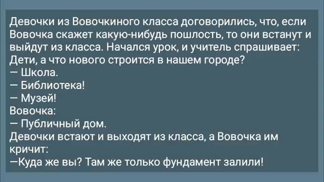 0:03 ночь жена трясёт мужа под спросони тань 0:07 ты с ума сошла три часа ночи что 0:09 случилось-то петь у меня голова прошла 0:16 грузин в отделе женского белья для нужны 0:19 трусики на девочку она учится в девятом 0:21 классе 0:22 продавщица а по точнее грузин в девятом 0:26 b 0:30 идет муравей по лесу навстречу ему 0:33 ящерица но я удивлена ой а ты кто я 0:37 динозавр так вы же вымерли врут болели 0:42 мы 0:45 девочки из вовочки на го класса 0:47 договорились что если вовочка скажет 0:49 какую-нибудь пошлость то они встанут и 0:51 выйдут из класса начался урок и учитель 0:54 спрашивает дети а что она у вас троица 0:56 нашем городе школа библиотека музей 1:01 вовочка публичный дом девочки встают и 1:04 выходят из класса а вовочка кричит куда 1:07 же вы там же только фундамент залили 1:13 сидят два электрика мимо идет batka 1:16 бабуль тебе провод не нужен какой провод 1:20 мелок а вот на земле лежит подошла взяла 1:24 посмотрела да не грязно больно и пошла 1:27 дальше один другому ну вот видишь от и 1:31 фаза фаза 1:36 мама а почему ты ночью папы на животе 1:39 прыгала да я хочу чтобы наш папа похудел 1:42 не получится мама почему когда ты на 1:46 работу уходишь тетя света из соседнего 1:48 подъезда папу по новой надувает