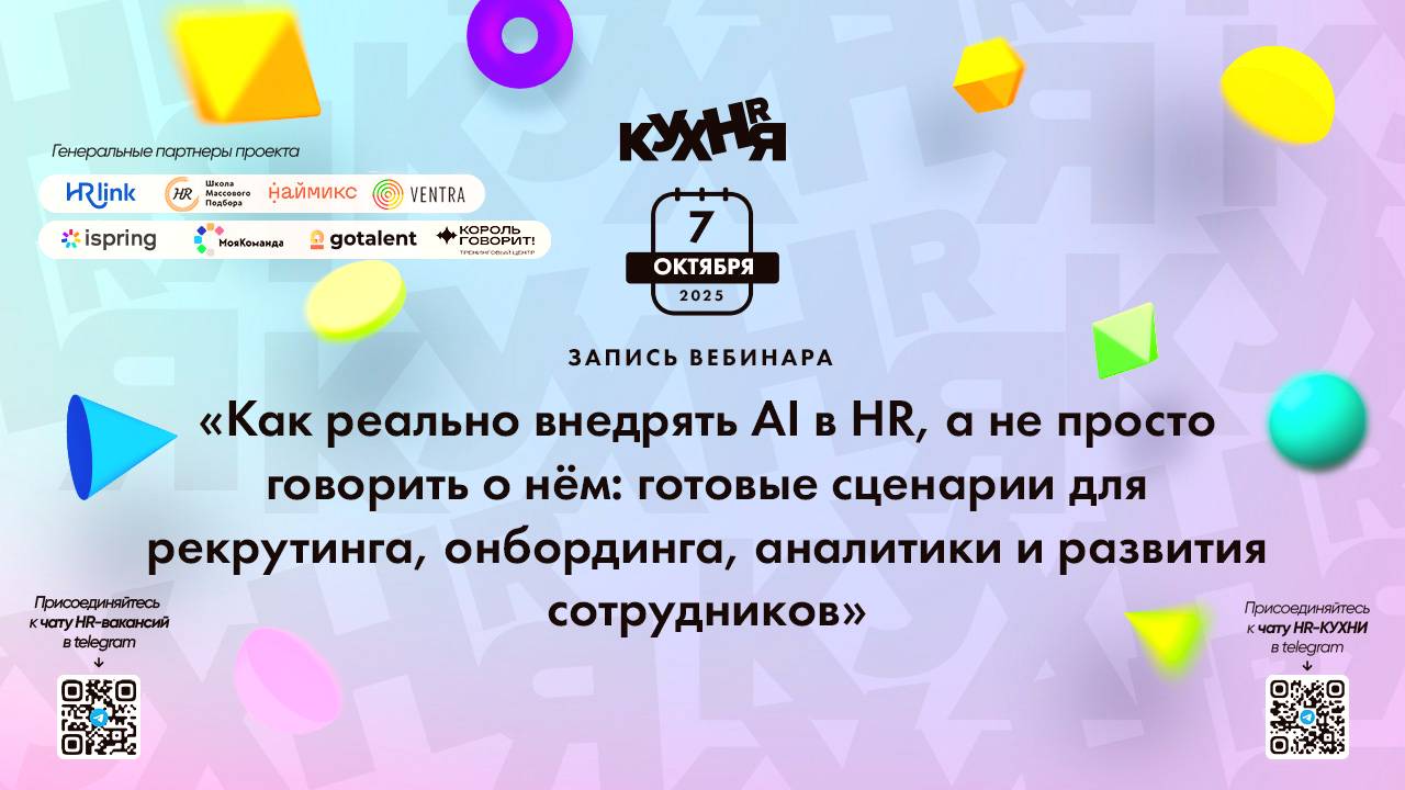 Присоединяйтесь к чатам и каналам HR-КУХНИ в телеграм: - Основной чат HR-КУХНИ в телеграм - https://t.me/+tYgAH0PgPQVkOWIy - Канал HR вакансий в телеграм - https://t.me/+CMNAN2u1hjo3M2Ri - Канал HR-EVENTS в телеграм - https://t.me/hr_kitchen - Канал HR JOURNAL в телеграм - https://t.me/hrkitchenjournal Полезные ссылки: - Каталог HR решений - https://hrkitchen.ru/exhibition - График конференций, бесплатных вебинаров, а также бесплатные курсы – https://hrkitchen.ru/ - Стать спикером HR-КУХНИ - https://hrkitchen.ru/speakers - Подписаться на полезную e-mail рассылку от HR-КУХНИ (новости, гайды, чек-листы, подарки от партнеров) - https://hrkitchen.ru/subscribe