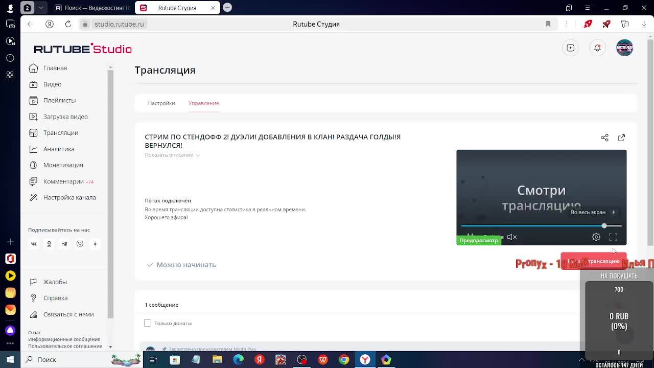 СТРИМ ПО СТЕНДОФФ 2! ДУЭЛИ! ДОБАВЛЕНИЯ В КЛАН! РАЗДАЧА ГОЛДЫ! ВЫПОЛНЕНИЕ КВЕСТОВ!! (ПРАЙС В ОПИСАНИИ). Я ВЕРНУЛСЯ!! Мой айди: 67489776 ДОНАТ ОПОВЕЩЕНИЯ ЧИСТО ПОДДЕРЖАТЬ МЕНЯ ОТ ДУШИ: Рандомное кол-во денег- глобглогабгалаб 10 рублей - деньги 50 рублей - сигма рик 100 рублей - СЕКРЕТ 200 рублей - СЕКРЕТ 500 рублей- ДЕНЬГИ ДЕНЬГИ ДЕНЬГИ!!! 5000 рублей- ВЗРЫВ ЯДЕРКИ ААААААААААААААА! ДОНАТИТЬ В ЗАКРЕПЕ ЧАТА ССЫЛКА!! ДОНАТИТЬ В ЗАКРЕПЕ ЧАТА ССЫЛКА!! Стендофф 2: Играть со мной Дуэлька.1VS1 : БЕСПЛАТНО Напарники .2vs2: БЕСПЛАТНО МM .5vs5 : БЕСПЛАТНО ⏳.Играть весь стрим - БЕСПЛАТНО 👑.Модерка: - 700 руб 🎉. Добавить в др - БЕСПЛАТНО Правила для модератора! 1) ●не спамить! 2) ●не писать капс локом! 3) ●не ругаться матом 4) ●не банить и кикать без причины. 5) ●быть активным на каждом стриме! 💡Хештеги💡: #standoff2 #стримnikitaplay #стримstandoff2 #стандофф #стримпостандофф2 #nikitaplay719