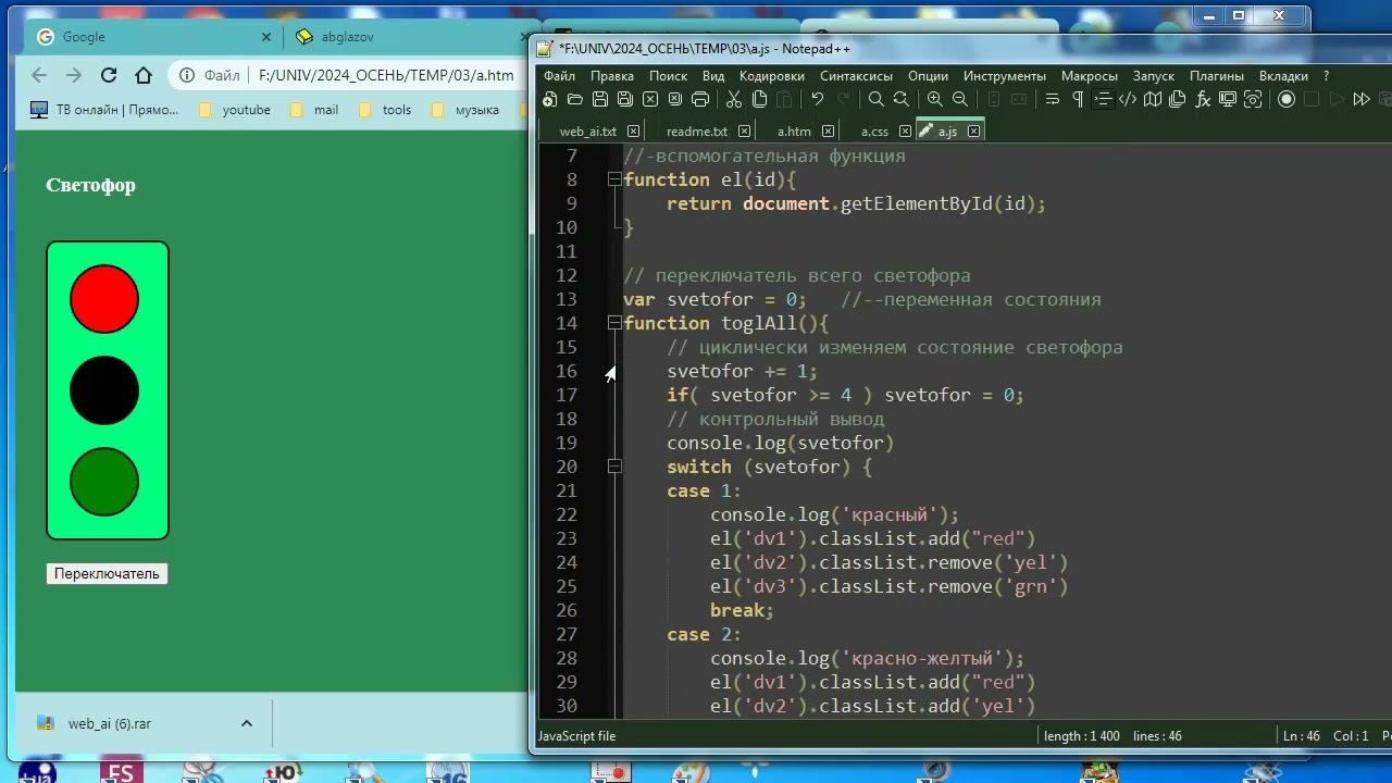 Продолжение курса для начинающих (начало в pr4_00 - pr4_02). К светофору из pr4_01 добавлена возможность переключения ламп по одиночке и в групповом варианте. Это достигнуто за счет обработчиков событий щелчков мышки по лампам и кнопке. Подробно разобран механизм обработки событий в исходнике. Видео является конспектом занятия и предполагает активную проработку. Материалы к нему можно скачать с моего сайта.