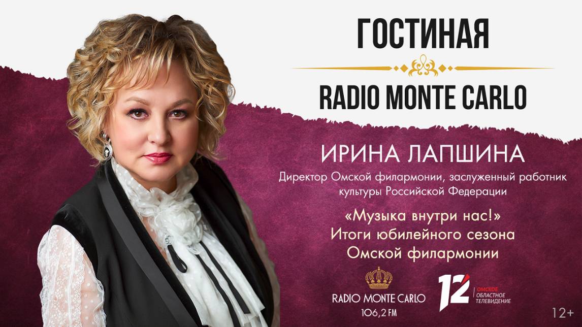 В гостях проекта «Гостиная Radio Monte Carlo» директор Омской филармонии, заслуженный работник культуры Российской Федерации Ирина Лапшина Главная тема эфира — «Музыка внутри нас!». Итоги юбилейного сезона Омской филармонии.
