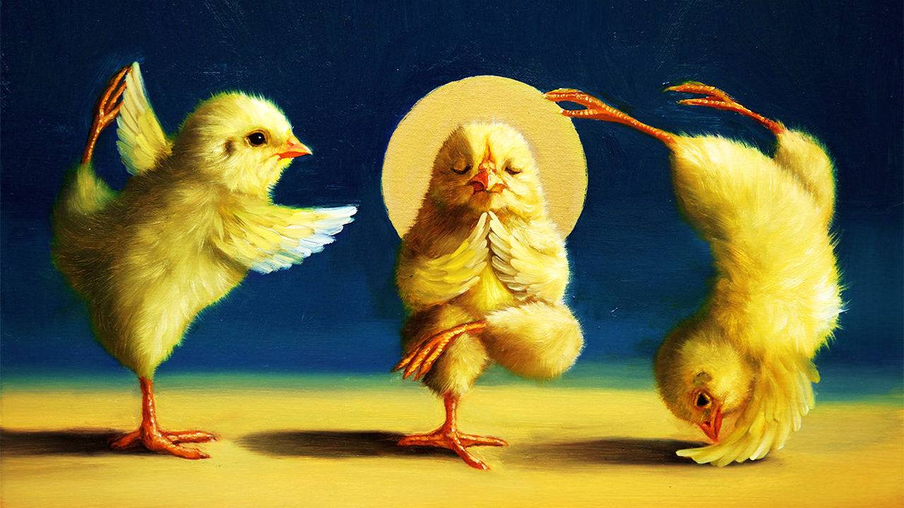 Йога цыплят художника Люсии Хэффернан Художник - иллюстратор Люсия Хэффернан (Lucia Heffernan)родилась в 1966 году в Тайване. Рисование увлекло ее с раннего детства, и мама, художница-акварелистка, всегда поддерживала дочь. В интернете о Люсии мало информации, но известно, что в 90-х годах она окончила университет Бингемтона (Binghamton University) по специальности графический дизайн. После окончания учебы Люсия занималась графическим и цифровым дизайном и основала свое дизайнерское агентство LDD. В 2000-х она продала агентство, переехала в Юту и занялась масляной живописью «Мои работы — это отражение моей любви к животным, которую я питаю к ним на протяжении всей жизни, — говорит о своем творчестве сама художница. —В своих рисунках я стремлюсь подарить животным особенный характер и индивидуальность. Я совмещаю их невинность и реальность мира, в котором живет человек. Это столкновение между животными и человеческими чувствами создает причудливый, театральный и часто юмористический мир». Музыка: Инструментальная музыка - Для души