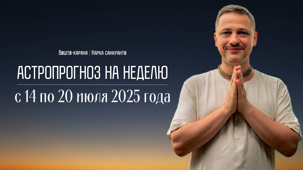 Астрологический прогноз на неделю. Разбираем дни с 14 по 20 июля 2025 года. С точки зрения ведической астрологии. Благоприятные и неблагоприятные дни, Вишти карана, Карка санкранти. Канал на Бусти: https://boosty.to/vedacast Канал в Telegram: https://t.me/vedacast Вконтакте: https://vk.com/vedacast Ведический календарь для вашего города на этом сайте: https://www.drikpanchang.com/panchang/month-panchang.html Если Вам было полезно это видео, Вы можете отблагодарить автора, отправив пожертвование для для развития его проектов. Номер карты Сбербанка: 4276550095320308 Номер карты Тинькофф: 5536914004364745 PayPal: https://www.paypal.com/paypalme/vedantakrit Стих из Бхагавад-гиты 17.19: мӯд̣ха-гра̄хен̣а̄тмано йат пӣд̣айа̄ крийате тапах̣ парасйотса̄дана̄ртхам̇ ва̄ тат та̄масам уда̄хр̣там Аскеза, совершаемая по глупости, сопровождаемая самоистязанием либо направленная на то, чтобы принести страдания или гибель другим, является тапасьей в гуне невежества. Понедельник: Раху-калам: 06:12 – 08:20 Гулика-калам: 14:43 - 16:50 Ямагандака: 10:27 – 12:35 Амрита-калам: 20:51 - 22:25 Абхиджит: 12:01 – 13:09 Вторник: Раху-калам: 16:50 – 18:57 Гулика-калам: 12:35 – 14:42 Ямагандака: 08:21 – 10:28 Амрита-калам: 19:29 - 21:03 Абхиджит: 12:01 – 13:09 Среда: Раху-калам: 12:35 – 14:42 Гулика-калам: 10:28 – 12:35 Ямагандака: 06:15 – 08:21 Амрита-калам: 21:43 - 23:16 Абхиджит: нет Вишти-карана: 18:31 - 05:37 следующего дня Четверг: Раху-калам: 14:42 – 16:48 Гулика-калам: 08:22 – 10:29 Ямагандака: 04:09 – 06:16 Амрита-калам: ночью Абхиджит: 12:02 - 13:09 Пятница: Раху-калам: 10:29 – 12:35 Гулика-калам: 06:17 – 08:23 Ямагандака: 16:48 – 18:54 Амрита-калам: 16:57 - 18:27 Абхиджит: 12:02 – 13:09 Суббота: Раху-калам: 08:24 – 10:30 Гулика-калам: 04:12 - 06:18 Ямагандака: 14:41 – 16:47 Амрита-калам: 17:38 - 19:08 Абхиджит: 12:02 – 13:09 Вишти-карана: 22:58 - 09:42 следующего дня Воскресенье: Раху-калам: 18:52 – 20:57 Гулика-калам: 16:46 - 18:52 Ямагандака: 12:35 – 14:41 Амрита-калам: 18:09 - 19:38 Абхиджит: 12:02 – 13:09 Таймкод: 00:00 - Введение 00:26 - Понедельник 01:23 - Гаджанана санкашти чатуртхи 04:44 - Вторник 06:18 - Среда 07:06 - Карка санкранти 09:52 - Четверг 11:13 - Стих из Бхагавад-гиты 13:01 - Пятница 14:20 - Суббота 16:01 - Воскресенье 18:08 - Заключение