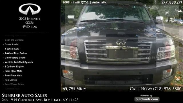Used 2008 Infiniti QX56 in Rosedale, Long Island, Brooklyn, Queens. Sunrise Auto Sales. Call us at (718) 978-5800 or visit http://www.sunriseautosales.com with Black Leather. 65295 miles. Automatic transmission.