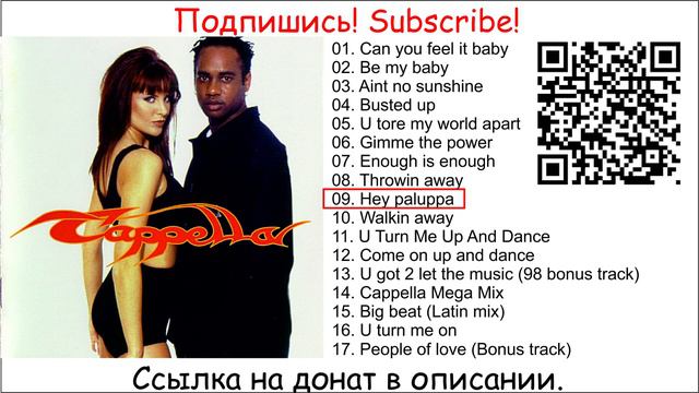 Благодарю за внимание к моим роликам! Чтобы поддержать канал монетой можно перейти по ссылке в описании канала или отсканировать QR код на экране. Попрошу вас подписаться на мой Дзен канал. Там я буду публиковать ролики, которые блокируются на этом канале. Заходите, там уже есть несколько видео. Ссылка в описании канала. 01. Can you feel it baby 00:00 02. Be my baby 03:50 03. Aint no sunshine 07:41 04. Busted up 11:33 05. U tore my world apart 15:43 06. Gimme the power 21:08 07. Enough is enough 25:56 08. Throwin away 30:45 09. Hey paluppa 35:35 10. Walkin away 40:30 11. U Turn Me Up And Dance 45:27 12. Come on up and dance 50:45 13. U got 2 let the music (98 bonus track) 54:58 14. Cappella Mega Mix 58:51 15. Big beat (Latin mix) 01:07:03 16. U turn me on 01:11:24 17. People of love (Bonus track) 01:16:35