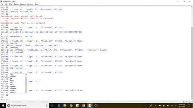 #Python#Dict#programming#tamil #Simple Dict sd = { 'Name':'Sathish', 'Age': 26, 'Country':'India' } print('Dict value is:', sd) # Updating the Value of Name Key sd['Name'] = 'New name' print('Updated Dict value is:',sd) # Inserting the new key value Pair sd['pincode'] = 637207 print('New Dict is:',sd) # printing Keys from the dict keys = sd.keys() print('The Keys are:',keys) # printing values from the dict values = sd.values() print('The Keys are:',values) #printing the items from the dict dict_values = sd.items() print('The Keys are:',dict_values) # removing the last item from the list remove_last_item = sd.popitem() print('Popitem is:',remove_last_item) print('After popitem the dict value is:',sd) #removing the key&value pair from dict remove_keyvalue_pair = sd.pop('Name') print('pop function removed:',remove_keyvalue_pair) print('After removing the key and value pair',sd) # Dict with list values new_dict = { 'Name':['Sathish','Divakar','Sarath'], 'Age':[26,23,27], 'Country':'India' } #Accessing the values from the dict with list Value1 = new_dict['Name'][0] Value2 = new_dict['Age'][2] print('The required value from:',Value1,',',Value2)