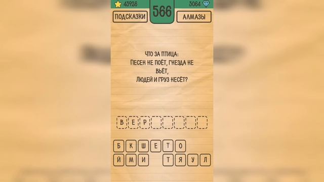Как пройти Загадки Ребусы Шарады, ответы, решение раздел Загадка Уровень 566 Что за птица: песен не поёт, гнезда не вьёт, людей и груз несёт? Привет, ребята! Пожалуйста, поддержите канал лайком ? и подпиской ? Напишите, какие игры вам ещё интересны. И я постараюсь пройти их для вас ?