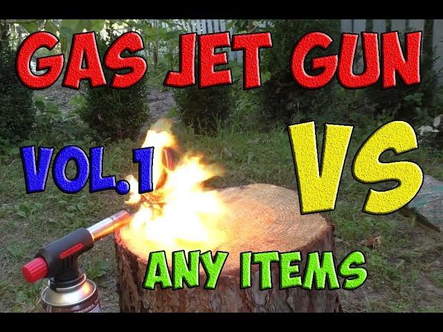 Awesome experiment - gas jet gun VS water, syrup, gas cylinder, lamp, shaving foam, shaving gel and oil can