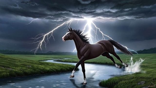 Конь бежит вдоль ручья на фоне грозы с молниями, аниме стиль