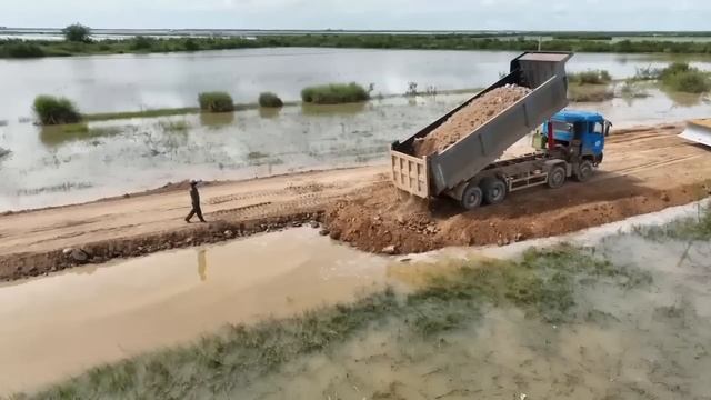 Бульдозер Komatsu толкает грунт для засыпки повреждённого и разрушенного участка дороги.