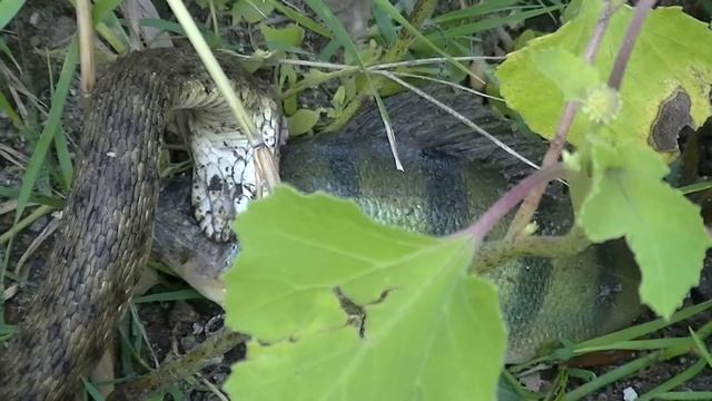 Случайно увидел как змея поймала окуня и пыталась его съесть.