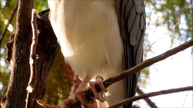 The black-crowned night heron (or night heron) is a medium-sized heron found throughout most of the world except for the coldest regions and Australasia, where it is hybridized with or replaced by the Rufous night heron. They have stocky, more powerful builds than other herons, using their powerful talons for catching prey at the water's edge. Black-crowned night herons stand at the water's edge until prey comes by, then ambushes its prey, mainly at night or early morning. From the water, these herons must appear to be only a white inconspicuous mass near the water's edge. Black crowned night herons eat small fish, crustaceans, frogs, aquatic insects, small mammals, and small birds. During the day they rest in trees or bushes. The scientific name Nycticorax nycticorax means "night raven," and this refers to the species' nocturnal habits and harsh raven-like call, which is demonstrated at the end of this video. The breeding habitat for this species is fresh and saltwater marsh throughout most of the world. Black-crowned night herons nest in colonies on platforms of sticks in groups of trees, or on the ground in protected islands or reed beds. Females lay 3-8 eggs per clutch. Eggs are white and elliptical, similar to chicken eggs in appearance.