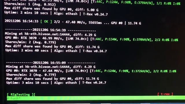 Colorful RTX 3070 using HiveOs T-rex 24.7 - hashrate