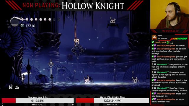 We fight an army of Zotes with this crazy build charm set! Come and join us on live show https://www.twitch.tv/marshbag12 Charms: Spore Shroom Quick Focus Stalwart Shell Grubsong Thorns of Agony Mark of Pride (Grubberfly's Elergy can also work here) The strat: The idea is simple everytime you take damage IMMEDIATELY heal and the spore will damage enemies, you will have more time to heal and your soul will keep up each time you take damage. It can be a little inconsistent and Zote being as random as he is, outcome can be different but its consistent run and good chance to heal in this fight which is rare. Really fun fight with a fun build to beat him