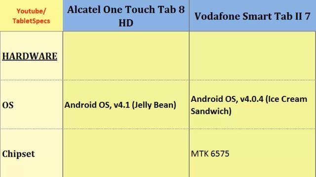 Alcatel One Touch Tab 8 HD VS Vodafone Smart Tab II 7, compare specs : One Touch Tab 8 HD over Smart Tab II 7, Both phones compared by their Dual-core, 1.6 GHz, 768 x 1024 pixels, 8.0 inches, 1 GHz, 600 x 1024 pixels, 7.0 inches, Ram, Operating System, Battery Life, FM Radio, HSDPA, Radio and such...