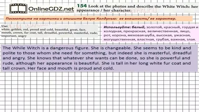 Другие решения смотри тут: https://urokitv.net/35-angliyskiy-yazyk-6-klass-biboletova-m-z Urokitv.net это школьные учебники и решебники с 1-го по 11-й класс школы. Ждем ваших предложений и пожеланий. Если вам нравится, то что мы делаем расскажите про нас своим друзьям и одноклассникам. В упражнении №154 вы должны описать внешность и характер Снежной Колдуньи. Воспользуйтесь лексикой, предложенной в упражнении, а также картинкой из учебника, на которой изображена Снежная Колдунья. Если вы хотите без ошибок сделать это задание, посмотрите наше видео. Unit 3 Section 7 Задание №154 - Английский язык "Enjoy English" 6 класс (Биболетова)