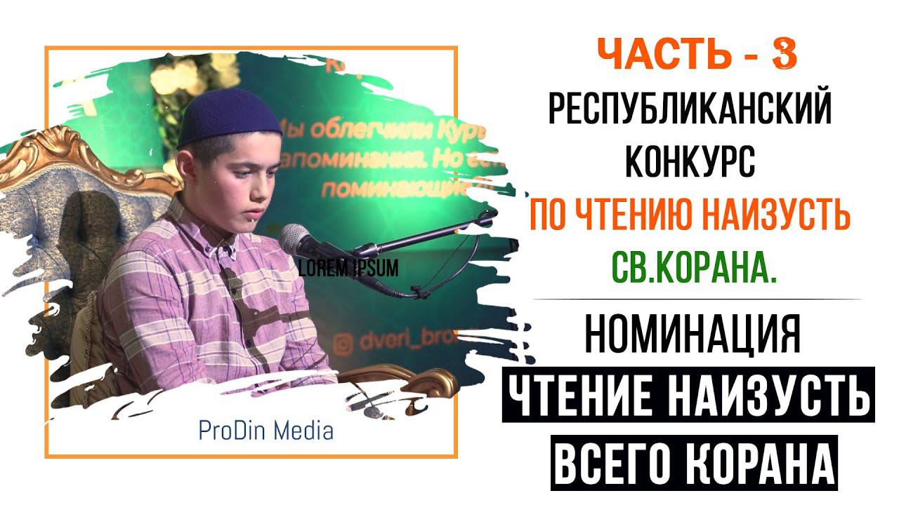 Предоставляем вашему вниманию Дагестанский республиканский конкурс по чтению наизусть св.Корана. Номинация - Чтение наизусть всего Корана.Часть - 3. Возраст участников не ограничен. Дагестанский республиканский конкурс хафизов благородного Корана, прошел 27-го ноября 2021 года в селении Дылым Казбековского района. Конкурс провели по 4 номинациям: 1. Чтение наизусть 30-ой части (Джуз) Корана. Возраст участников до 12 лет включительно. 2. Чтение наизусть (5 Джузов) с суры аль-Фатиха до конца пятого джуза включительно. Возраст участников до 15 лет включительно. 3. Чтение наизусть всего Корана Возраст участников не ограничен. 4.Красивое и правильное чтение одной страницы Корана (кроме 30-го джуза) с соблюдением правил махраджа и таджвида.Внимание! Досматривайте видео до конца. Частичный просмотр видео вызовет у вас неполноценное мнение о теме. Спасибо за просмотр! Поставьте лайк и напишите комментарий, если Вам понравилось! Чтобы быть в курсе новых видео, нажмите на знак оповещения "" после подписки С уважением ProDin Media. От нас работа- от вас подписка. https://www.youtube.com/ProDinMedia Станьте спонсором канала, и вы получите доступ к эксклюзивным бонусам. Подробнее: https://www.youtube.com/channel/UC2yGKGCZe27CBMEieWkbjVw/join Поддержать канал вы можете средствами. Наши реквизиты: 5398 7700 7242 5777 Киви кошелёк / QIWI 4890 4947 3344 0077 Донат https://www.donationalerts.com/r/prodin_media ислам #ПроДинМедиа #Коран #ProDinMedia | ПроДинМедиа | ProDinMedia