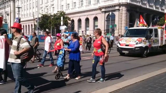 Забастовку организовали работники общественного транспорта против изменений в трудовом кодексе Франции. все очень организованно, под охранной полиции, с транспорантами и песнями. Процессия проходила по главной улице Ниццы. Транспорт не ходил весь день.