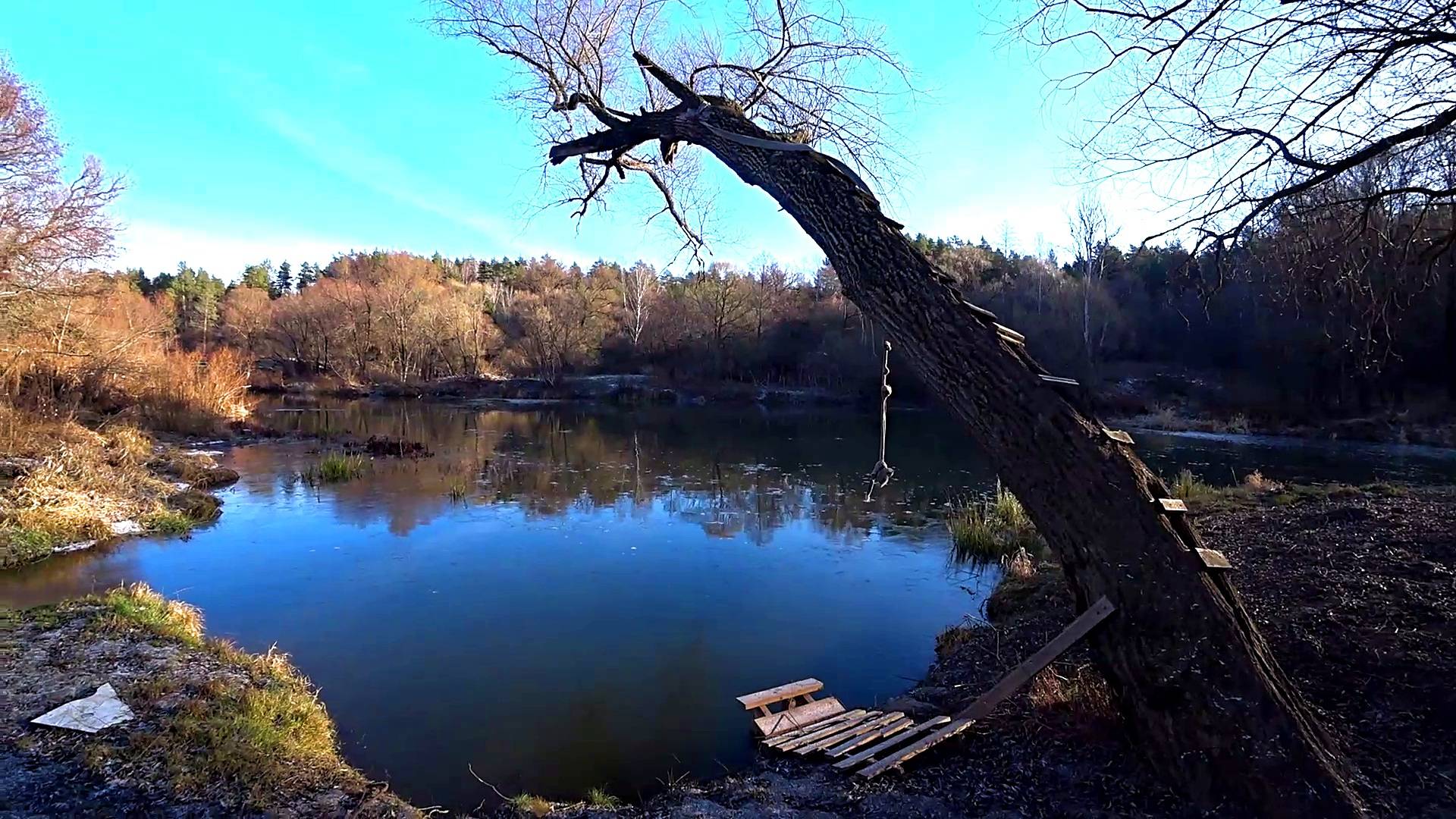 Прокатился по ближним прудикам и речкам. Проверил где есть лёд и какой он толщины.