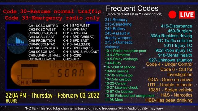 Daily Reset at 12pm and 12am Frequency List - https://tinyurl.com/KCBfreq Police Codes PDF - https://tinyurl.com/KCBcodes Scanner Model - Bearcat 350C https://tinyurl.com/KCB350 Antenna - HG Scanner https://tinyurl.com/KCBHGantenna Budget Scanner - Baofeng UV5R https://tinyurl.com/KCBUV5 Budget Antenna - Nagoya NA-771 https://tinyurl.com/KCBNA771