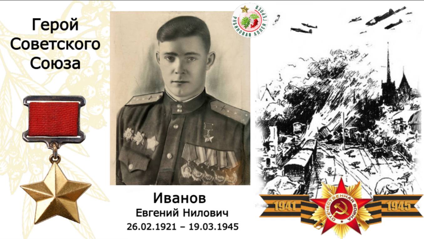 Командир эскадрильи, капитан Евгений Иванов воевал в небе Ленинграда, бомбил позиции врага, эшелоны и склады на разных фронтах. В январе 1945 г. ИЛ-2 Евгения в небе Польши был атакован немецкими истребителями и подбит. Командир эскадрильи развернул свой пылающий штурмовик прямо на вражеские позиции, где располагалась минометная батарея. Прогремел взрыв… Героический экипаж штурмовика погиб…
