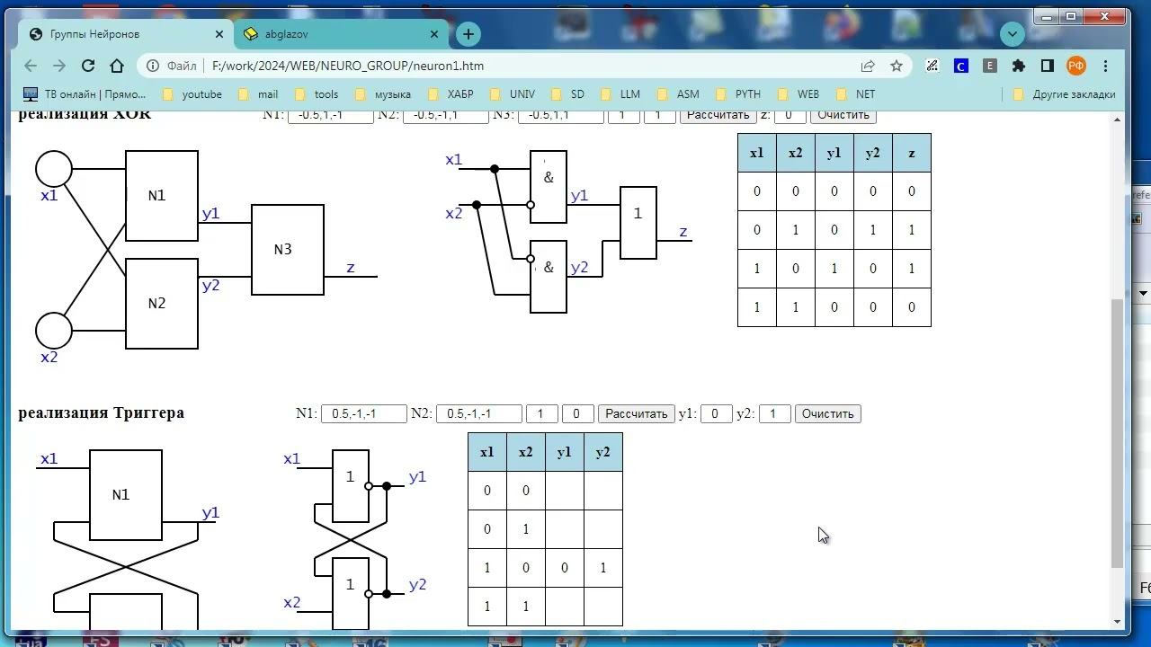 Продолжение wb157. Показано, что количество переходит в качество, так на двух нейронах можно реализовать ячейку памяти, а на трех - схему XOR. В общем случае магия нейронных сетей основана на нелинейности функции включения, положительных обратных связях и увеличении числа нейронов и их слоев. Предоставлена возможность проведения экспериментов с данным приложением online на моем сайте. Исходники при желании можно скачать на моем сайте.