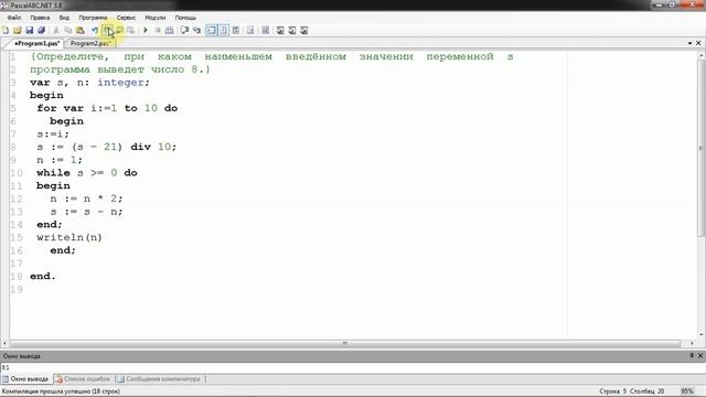 Определите, при каком наименьшем введённом значении переменной s программа выведет число 8. var s, n: integer; begin for var i:=1 to 100000 do begin s:=i; s := (s - 21) div 10; n := 1; while s 'больше'= 0 do begin n := n * 2; s := s - n; end; if n=8 then begin print(i); break end; end; end.