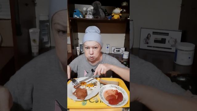 мукбанг, жареная колбаса и яичница