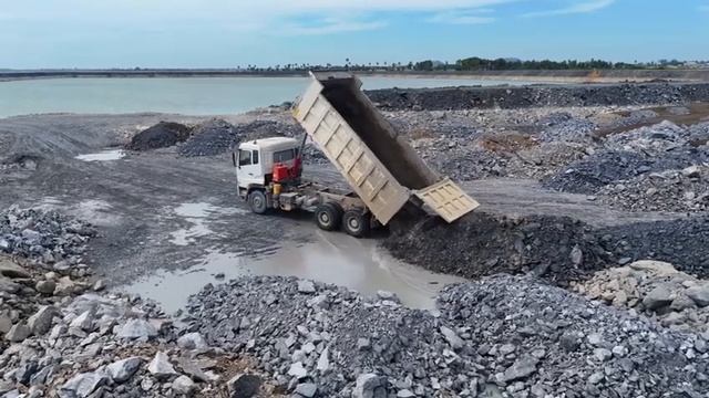 Ep1. Отсыпка огромного озера. Бульдозер Shantui и грузовики засыпают участок.