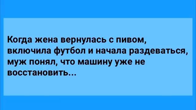 0:03 сидят два мужика на берегу реки рыбу 0:05 ловят 0:06 один-другому говорит слышь ты это моей 0:09 жене ходишь и хорошо тот восклицает вас 0:12 петровых не поймешь жена говорит хорошо 0:14 ты не хорошо 0:19 муж подарил жене шубу она разочарована 0:22 да это же кроличий мех я же в этой шубе 0:24 мерзнуть буду не выдумывай кролик ее всю 0:27 жизнь носил и ничего не мерз влась а у 0:34 меня дядя умер не одолжишь не черный 0:36 костюм помню тебя был такой конечно без 0:39 проблем проходит месяц встречается ты 0:42 мне костюм когда вернешь так я же тебе 0:44 говорю у меня дядя умер в нем и 0:46 схоронили 0:51 когда жена вернулась пивом включила 0:53 футбол и начала раздеваться муж понял 0:55 что машина уже не восстановить 0:58 [аплодисменты] 1:01 возвращается пьяный в стельку муж домой 1:03 жена орёт на него ты ещё скотина пить 1:05 будешь тот молчит 1:07 она снова ты будешь еще пить тот снова 1:10 молчит 1:10 я тебя спрашивает еще пить будешь ну 1:13 ладно наливай 1:19 мужчине дорогая как тебе удаётся быть 1:22 такой спокойный после того как я на руну 1:24 тебя я просто чищу унитаз 1:26 как же это может успокаивать а я чищу 1:29 его твоей зубной щеткой моряк 1:34 возвращается из дальнего плавания 1:36 естественно тащить жену в постель они 1:38 отрываются по полной программе и вдруг 1:40 слышит стук стену и голос соседа ну что 1:43 за безобразие 1:44 уже целый месяц каждую ночь ахи ахи и 1:46 как поспать не дадут