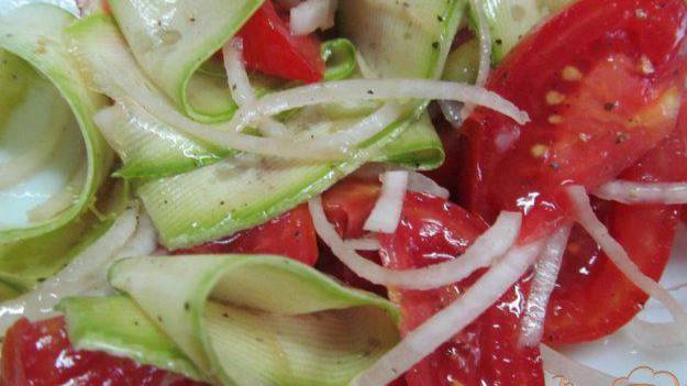 Салат из кабачка, помидора и лука. Лук использовать лучше белый салатный или красный. Кабачок нужно нарезать очень тонкими языками, используя нож для чистки овощей, что бы они лучше замариновались. Очень вкусный, легкий салат. Ингредиенты: Кабачок - 0,5 шт., Лук белый - 0,5 шт., Помидор - 2 шт., Уксус 5% - 1-2 ст.лож, Масло оливковое - 3 ст лож., Соль - по вкусу, Сахар - щепотка, Перец черный - по вкусу, Благодарим за просмотр! Подписывайтесь на канал🍕