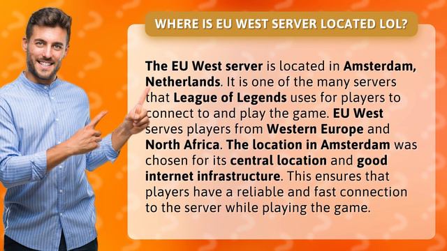 Discover the Secret Location of the EU West Server for LOL! Uncover the Ultimate Gaming Destination in Amsterdam, Netherlands - the Central Hub for Western Europe and North African Players. Join the Fun and Experience a Reliable and Fast Connection to the EU West Server with Top-Notch Internet Infrastructure. Get Ready to Rule the Rift with Unmatched Gaming Experience - Only on League of Legends!