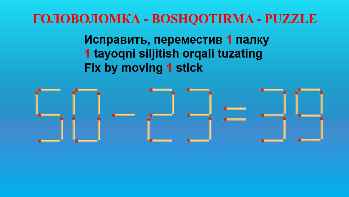 ГОЛОВОЛОМКА - BOSHQOTIRMA – PUZZLE. Спичка. 50-23=39, 83+20=63, 80-39=53, 88-35=62