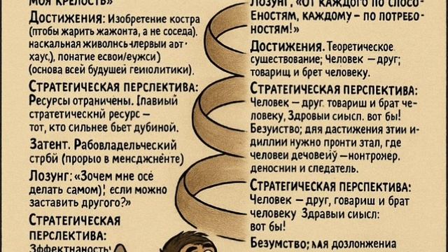 Краткий путеводитель по спирали прогресса для особливо одарённых приматов. Остальных прошу не беспокоиться. Дорогие собратья по разуму и без оного! Позвольте представить вам величественную картину вашего развития, которую мы, в приступе безудержного оптимизма, называем «Историей или истерией». Начнем - пещерная стадия (стартовая позиция) Лозунг: «Моя палка-копалка — моя крепость». Достижения: Изобретение костра (чтобы жарить мамонта, а не соседа), наскальная живопись (первый арт-хаус), понятие «свой/чужой» (основа всей будущей геополитики). Стратегическая перспектива: Ресурсы ограничены. Главный стратегический ресурс — тот, кто сильнее бьёт дубиной. Здравый смысл диктует: выживает стая. Безумство шепчет: а можно дубиной по голове вождя? Затем. Рабовладельческий строй (прорыв в менеджменте) Лозунг: «Зачем мне всё делать самому, если можно заставить другого?» Достижения: Появление иерархии (ты царь, ты раб, ты пока не определился), массовое строительство (пирамиды, акведуки — идеальные объекты для рабского труда), философия (чтобы оправдать существование цепей красивыми словами). Стратегическая перспектива: Эффективность! Один думает, тысяча работает. Здравый смысл: специализация повышает производительность. Безумство: а что, если рабы тоже захотят думать? Быстро подавляем креативность копьём. Следом. Феодализм (ребрендинг рабовладения) Лозунг: «Бог, Король и Моё Право Иметь Крепость Круче Твоей». Достижения: Разработка концепции «землевладения» (всё, что видишь, — моё, а за лесом — тоже моё, я просто ещё не доехал), изощрённая система вассалитета (сложная пирамида, где все друг другу должны, но платят те, кто внизу), рыцарство (гламурное насилие с кодексом чести). Стратегическая перспектива: Деконцентрация власти! Теперь у тебя не один большой хозяин, а десяток мелких, и все требуют урожай. Здравый смысл: локальное управление гибче. Безумство: давайте устроим 100-летнюю войну, чтобы выяснить, чей местный бог круче. Вдруг откуда ни возьмись. Капитализм (дикий, но в цилиндре) Лозунг: «Твоё время — деньги, а мои деньги — это только мои деньги». Достижения: Деньги стали самоцелью (а не средством обмена, как наивно полагали предки), конвейер (чтобы человек чувствовал себя винтиком, а не творцом), реклама (искусство создания потребностей в том, без чего прекрасно жили 1000 лет). Стратегическая перспектива: Невидимая рука рынка всё расставит по местам! Здравый смысл: конкуренция двигает прогресс. Безумство: а что, если рынок решит, что выгоднее продавать воздух или детские мечты? Отличная бизнес-модель! Вперёд! Приплыли. Социализм (прекраснодушный бунт против цилиндра) Лозунг: «От каждого по способностям, каждому — по пайке и очереди на жильё». Достижения: Теория всеобщего равенства (на бумаге), всеобщая грамотность (чтобы все могли читать лозунги), пятилетки за три года (математика — царица наук, но партия — царица математики). Стратегическая перспектива: Коллективное разумение! Здравый смысл: если всем дать шанс, общество станет справедливее. Безумство: для построения рая для всех нужно сначала найти врагов рая и построить для них особые учреждения с колючей проволокой. И на закуску. Коммунизм (светлое будущее, которое всегда в процессе строительства) Лозунг: «От каждого по способностям, каждому — по потребностям! (Потребности определяет спец