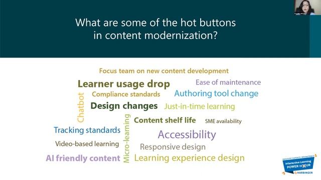 Watch Harbinger Interactive Learning Power Hour session on ‘Content Modernization: Smart Strategies for Legacy Content’. The session was intriguing and insightful, wherein industry stalwarts shared their rich experiences on the significance and benefits of content modernization, and the best approaches to implement a successful modernization strategy. Watch Dr. Vikas Joshi, CEO at Harbinger Group, in conversation with our panelists Paul Schneider, Ph. D., SVP Business Development at dominKnow Inc., Praveena Mitran, Digital Learning Lead at Bahwan CyberTek and Rohan Bhosle, Associate Director at Harbinger Interactive Learning. #Content #Modernization #LegacyContent #eLearningModernization #LearningContent Here are the key takeaways from the session: • Know the significance and benefits of content modernization • Understand the areas of concerns that organizations have with respect to modernization • Discover best approaches that companies have adopted for modernizing their legacy content Get in touch with Harbinger Interactive Learning: https://bit.ly/3ze1QTo Visit our website: https://harbingerlearning.com/ Our Social Media Links: Twitter: https://twitter.com/harbingerlearn LinkedIn: https://www.linkedin.com/company/harb...