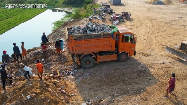 Мини-бульдозер продвигает камни и валуны в воду, а самосвал выгружает грунт.