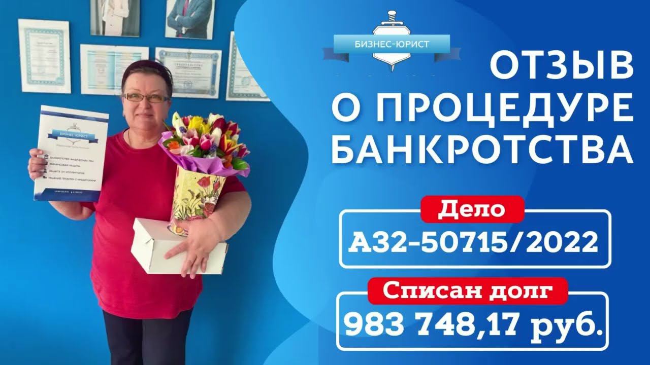 Екатерина Ивановна (дело А32-50715/2022) обратилась к нам в Компанию с долгом 983 748,17 руб. Клиент оказался в долговой яме, из-за которой большая часть пенсии уходила на выплату кредитов и не оставалось средств на жизнь. Но благодаря усилиям наших юристов через 5 месяцев долг был полностью списан, а Клиент стал финансово свободным! Банкротство физ лиц - списание долгов (кредиты, займы, налоги, штрафы, ЖКХ и проч.). Коллекторы, приставы, банки: забудьте о них навсегда! Работаем в РОССИИ и КАЗАХСТАНЕ! БЕСПЛАТНАЯ консультация по банкротству от ведущего юриста: по номеру 8-800-600-25-56. Звоните, мы будем рады Вам помочь! Спишем Ваши долги или выплатим их за Вас! Отзывы наших Клиентов: https://youtube.com/playlist?list=PLwAfB0AyBrR1Z1--nFl9rx9gf8D4bO5AR #банкротство #банкротствофизлиц #банкротствограждан #приставы #коллекторы #долгипокредитам #списатьдолги