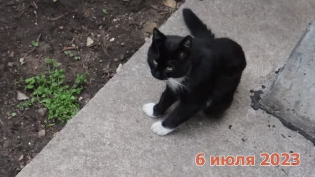 Уличный кот Косой приводит себя в порядок.