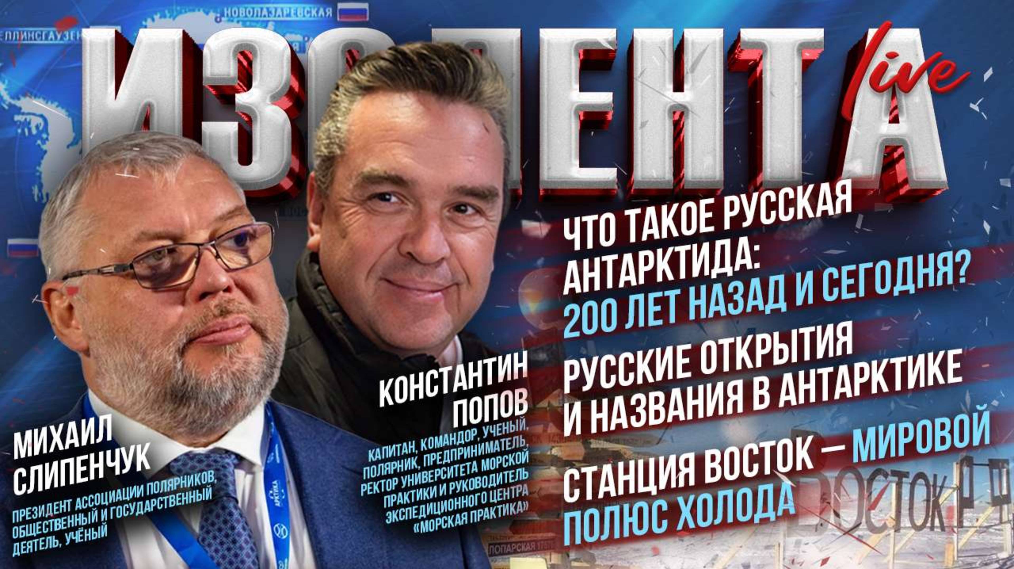 В гостях у капитана, ученого, полярника, ректора Университета Морской практики и руководитель экспедиционного центра «Морская практика» Константина Попова президент Ассоциации полярников, учёный, заведующий кафедрой рационального природопользования Географического факультета МГУ Михаил Слипенчук. Говорили о русских открытиях в Арктике и Антарктике, о мировом полюсе холода — станции Восток, а также причинах популярности туров по Арктике и Антарктике. «Морская практика»: https://sea-practice.com/ Константин Попов: https://t.me/chelovek_iparokhod Пётр Лидов: https://t.me/pvsgns Трофим Татаренков: https://t.me/NeBrigada Задонатить, участвовать в голосовании и задать вопрос можно тут: https://donate.stream/izolentalive. Нравятся наши выпуски? Подпишись на «Изолента+»: https://t.me/tribute/app?startapp=sr3 Изолента в Телегам https://t.me/izolentalive Изолента ВКонтакте https://vk.com/izolentalive Изолента в Одноклассниках: https://ok.ru/group/70000002758400 Кулинарный проект "Мужики на кухне": https://t.me/tribute/app?startapp=si76 Радио Sputnik: https://t.me/radio_sputnik «ИзоТОЛК» — это новый проект «ИзолентаLive» и «Изолента+»! Есть что сказать? Оставь заявку здесь: https://t.me/IzoTalkBot. Книга Трофима «Темник», как говорят злые языки, главная книга года. Купить её можно тут: https://litgid.com/catalog/sovremennaya_proza/temnik/