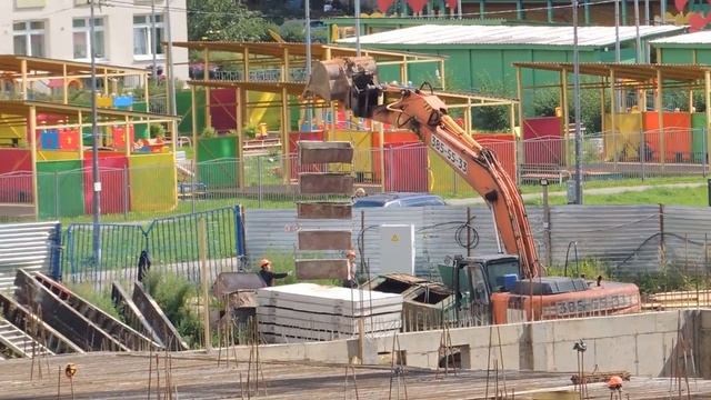 КАМАЗ Шаланда едет на стройку, разгружает Экскаватор
