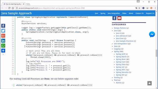 http://javasampleapproach.com/java-integration/start-spring-async-spring-boot How to start Spring Async with Spring Boot For scaling a heavy system, Java provides a mechanics for executing expensive jobs in background with Java Thread Pool & Future to manage the final results. Spring Framework makes it more easy with annotation @Async. In the How to start Spring Async with Spring Boot, JavaSampleApproach will guide you how to build asynchronized services with @Async & Spring Boot. Related Posts: 1. How to create a Java Thread http://javasampleapproach.com/java/java-advanced/create-java-thread 2. Java Thread Pool – ExecutorService http://javasampleapproach.com/java/java-advanced/java-thread-pool-executorservice 3. Spring ThreadPoolTaskExecutor with Callable interface for concurrency programming http://javasampleapproach.com/spring-framework/spring-boot/spring-threadpooltaskexecutor-callable-interface-concurrency-programming 4. Java Future http://javasampleapproach.com/java/java-core/java-future I. Techonologies for How to start Spring Async with Spring Boot – Java 1.8 – Maven 3.3.9 – Spring Tool Suite – Version 3.8.1.RELEASE – Spring Boot II. Overview 1. Project Structure 2. Step to do – Create Spring Boot project – Create an Asynchronized Service – Customize Async Executor – Create Client to use @Async Service – Run & Enjoy Results III. Practices 1. Create Spring Boot project – Open Spring Tool Suite, on main menu, choose File-New-Spring Starter Project, add project info. Press Next, then Finish, a Spring Boot project will be created successfully. 2. Create an Asynchronized Service Create a Service with an asynchronize method process() by using @Async. So the process() method wil be executed in a separated Thread when be invoked. 3. Customize Async Executor By default, Spring provides a SimpleAsyncTaskExecutor executor. Spring also supports an AsyncConfigurerSupport class to customize AsyncExecutor. @EnableAsync is used to detect ansynchronized method with @Async by Spring. 4. Create Client to use @Async Service In the main Spring Boot class, we implement a run() function of CommandLineRunner 5. Run & Enjoy Results Run Project with Spring Boot mode & Enjoy the Logs IV. Sourcecode Spring Async