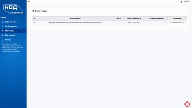 Поздравляем вас с окончанием курса по проекту «Код будущего». Чтобы получить сертификат о прохождении обучения, необходимо пройти итоговое тестирование и социологическое исследование. Как пройти итоговое тестирование и социологическое исследование - Тестирование проходит на специальной платформе https://futurecode.rustest.ru/itisi - Чтобы приступить к тестированию, вам необходимо авторизоваться через вашу учетную запись платформы Университета 2035 (Leader-ID). Если забыли пароль, восстановить его можно по ссылке (https://leader-id.ru/forgot-password) - После авторизации на платформе тестирования вы попадете на главную страницу – рабочий стол. С этой страницы вы сможете перейти к пробному итоговому тестированию и итоговому тестированию и социологическому исследованию. Ознакомьтесь с приведенной на странице инструкцией, как пройти итоговое тестирование и социологическое исследование. - У вас будет только 1 попытка пройти итоговое тестирование. Среднее время прохождения теста - 60 мин. Тестирование будет доступно в течение 3 часов с момента его запуска. Учтите, что отведенное на прохождение теста время беспрерывно, и при выходе с платформы вы сможете вернуться к тесту только в рамках отведенных 3 часов. - Рекомендуем пройти сначала пробное тестирование (демоверсию), чтобы познакомиться с методикой теста и интерфейсом. Пройти демоверсию можно неограниченное количество раз. - В рамках итогового тестирования вам нужно будет ответить на четыре блока вопросов: мотивационный, диагностики общих знаний, необходимых для изучения IT дисциплин (алгоритмика), основы программирования и социологическое исследование. Рекомендуем пройти тестирование в течение 14 (четырнадцати) рабочих дней с даты, указанной в письме образовательной организации, которая пришлет вам пригласительное письмо для прохождения итогового тестирования и социологического исследования. - Если появятся вопросы по тестированию, позвоните на горячую линию 8-800-700-20-36 или напишите на электронную почту futurecode@2035.university. - После успешного прохождения итогового тестирования и социологического исследования сертификат об окончании курса появится в личном кабинете на платформе Университета 2035 в разделе «Документы» (https://steps.2035.university/account/documents).