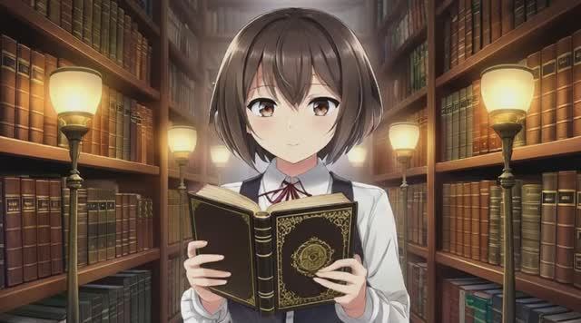 Аниме-аватар молодой девушки-библиотекаря с мягкими карими глазами и короткой стрижкой, стоящей среди стеллажей старинных книг; тёплое освещение ламп, атмосфера уюта и загадочности, поза уверенная, держащая старинную книгу с золотым тиснением.