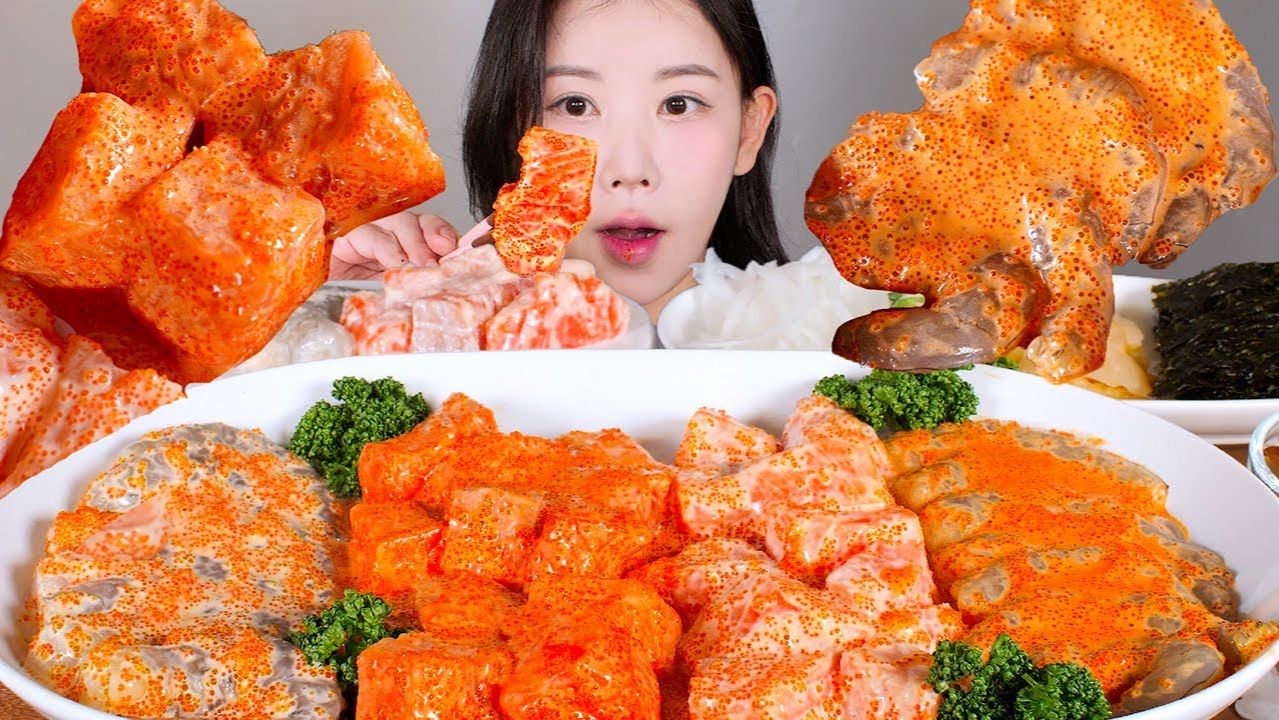 МУКБАНГ / Пельмени с лососем и пельмени с креветкой + много майонеза 🥟🍤