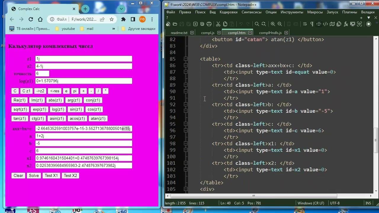 Создан простой класс комплексных чисел на JavaScript. С его помощью написано HTML приложение, позволяющее реализовывать простую обработку таких чисел и решать квадратное уравнение с произвольными коэффициентами. Исходники, как всегда, берем с моего сайта(смотри в описании канала). Попробовать без скачивания тоже на моем сайте в меню "Online".