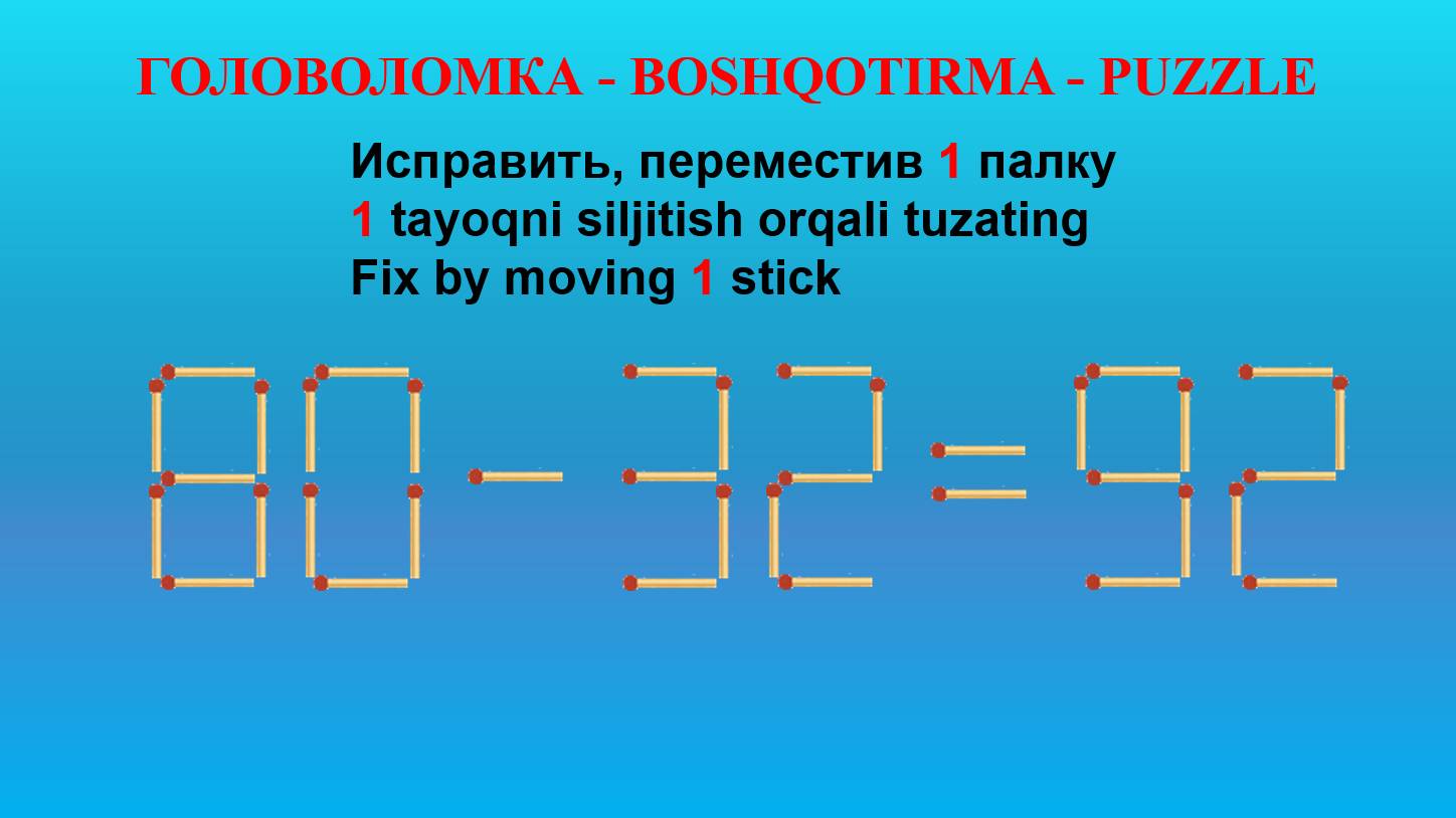 ГОЛОВОЛОМКА - BOSHQOTIRMA – PUZZLE. Спичка. 80-32=92, 86+33=39, 65-38=33, 35+42=53